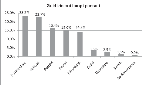 Unicità e desiderio di rivendicare proprie peculiarità culturali, territoriali e tradizionali come condizioni che rappresentano sicurezze e garanzie, a fronte di elementi, come riferito in precedenza, che indicano una certa aspirazione a modificarne alcuni aspetti. La rassicurazione fornita dal ricordo dei tempi passati e dalle tradizioni, dai legami familiari e dal far parte di una rete sociale, vengono percepiti come la base sicura da cui potrebbe partire l’innovazione, accettando anche una parte di rischio connesso al nuovo, a ciò che non si conosce ancora, e che pertanto non è prevedibile in modo chiaro. Passato cioè come periodo da ricordare e positivo, ma in generale da non idealizzare o esaltare.