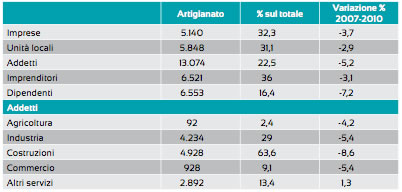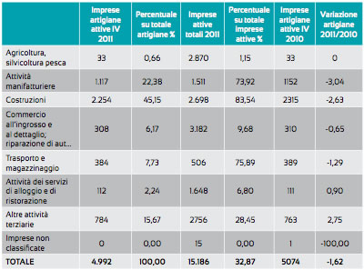 Nel 2011 il totale delle imprese artigiane registrate è stato a pari a 4.999 unità (80 in meno che a fine 2010), di cui 4.992 imprese attive. La riduzione rispetto all'anno precedente è dell'1,58% Per quanto riguarda le imprese artigiane attive si è passati da 5.074 imprese a 4.992 con una riduzione anche in questo caso dell'1,6%.