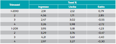 Figura 10.12 - Variazioni tendenziali (corrette per i giorni lavorativi) delle principali variabili settore artigianato per i quattro trimestri 2010 e 2011. Fonte: elaborazione CCIAA Sondrio su dati Unioncamere Lombardia