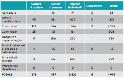 Figura 10.3 - Quadro riassuntivo delle imprese artigiane per settore e forma giuridica. Fonte: elaborazione CCIAA Sondrio su dati Movimprese