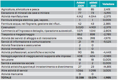 Seguono, poi, gli addetti alle attività manifatturiere, pari a circa un terzo del totale degli addetti artigiani con una riduzione del 2% rispetto al 2009. Complessivamente rispetto al 2009 gli addetti del comparto artigiano si sono ridotti dell'1,98%.