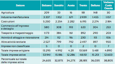 Come si può notare è il settore delle costruzioni quello che presenta la maggior concentrazione di imprese artigiane; ad Aosta più di un'impresa artigiana su due (54,2%) opera nel settore dell'edilizia, mentre nelle altre province la percentuale è più bassa ma rimane fra il 39,9% di Bolzano e il 45,6% di Trento. Altra attività economica che presenta un numero elevato di imprese artigiane sul totale è l'industria manifatturiera, con una quota che mediamente è di circa 21-26% delle imprese artigiane.