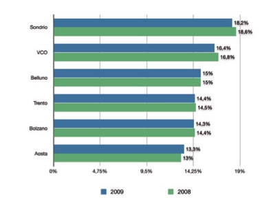 Rispetto al 2010 si osserva una diminuzione delle imprese in quasi tutte le province: Sondrio registra la riduzione maggiore (-1,62%) seguita da Belluno (-1,30%), Verbano-Cusio-Ossola (-1,29%), Aosta (-1,27%) e Trento (-0,90%). Unica variazione positiva è da registrarsi a Bolzano con lo 0,4% delle imprese artigiane in più rispetto al 2010.