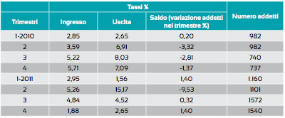 Dando uno sguardo anche alla dinamica dell'occupazione nel commercio, secondo le rilevazioni dell'indagine congiunturale effettuata, il saldo nel 2011 è positivo a fine anno, con un tasso d'ingresso decisamente superiore a quello d'uscita. Negli altri trimestri,invece, il saldo registrato è stato negativo a differenza di quanto avvenuto nel 2010.