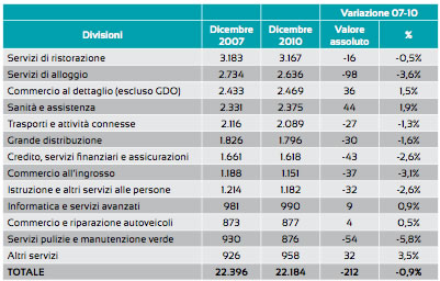 Contrazioni più significative si sono verificate nel settore dei servizi di pulizia e manutenzione del verde (-5,8%), nei servizi di alloggio (-3,6%), commercio all'ingrosso (-3%) credito e finanza (-2,6%) istruzione (-2,6%). All'opposto registrano segno positivo in particolare sanità e assistenza (+1,9%) altri servizi (+3,5%) e commercio al dettaglio (+1,5%).
