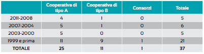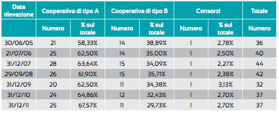 Osservando la figura 12.12 possiamo notare che, al 31 dicembre 2011, risultano iscritte all'albo 37 cooperative sociali, 5 cooperative in più rispetto alla fine del 2009, senza nessuna variazione rispetto al 2010 sul dato complessivo, con una cooperativa di tipo A in più ed una di tipo B in meno.