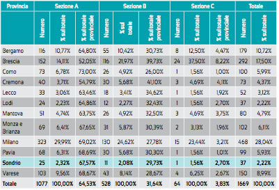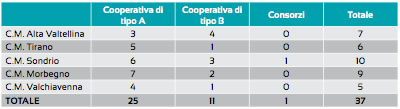 A livello complessivo, possiamo osservare che il totale di cooperative sociali in Lombardia all'8 febbraio 2012 è 1.669. Le cooperative sociali della provincia di Sondrio rappresentano il 2,22% del totale regionale. A livello regionale le cooperative di tipo A rappresentano il 64,5% del totale, quelle di tipo B 31,6il % del totale; in provincia di Sondrio le cooperative di tipo A sono il 67,5% del totale, quelle di tipo B il 29,7 % del totale.