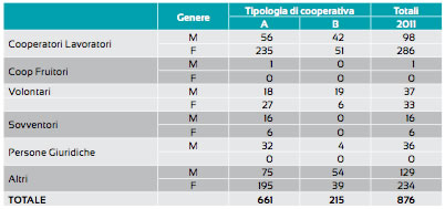Se si sposta l'attenzione alla componente associativa delle cooperative sociali, è possibile rilevare che queste raccolgono per le cooperative A e B 876 soci, in leggero aumento rispetto al 2010 quando erano 854. La componente femminile è molto alta (63,8% sul totale, dato costante rispetto al 2010). Se scomponiamo il dato nei suoi singoli fattori possiamo riscontrare la situazione registrata nella tabella seguente(figura 12.17):
