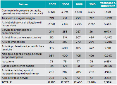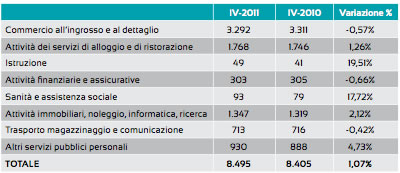 Se si dà uno sguardo al dettaglio delle variazioni, si può notare che per le attività registrate molti sono gli incrementi, in particolare per le attività legate all'istruzione (+19%) e alla sanità e altri servizi sociali, che continuano con la crescita già registrata nel 2010 per un nuovo incremento del 17,7%. Dati di crescita si registrano anche per attività immobiliari e informatica e altri servizi pubblici, mentre dati leggermente negativi si registrano per le attività finanziarie (-0,6%), per il commercio all'ingrosso (-0,57%) per i trasporti (-0,42%).
