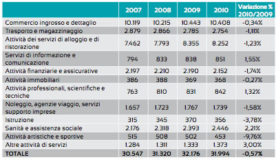 Nel passaggio dal 2010 al 2011 non si registrano variazioni significative rispetto al peso delle imprese del settore commercio sul totale. Non si osservano particolari variazioni nemmeno sul fronte delle attività specifiche legate ai servizi che rappresentano sempre una quota pari a circa il 20% in tutti i territori.