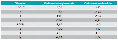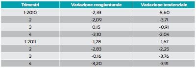 Se si osservano invece le variazioni tendenziali, i dati sono sempre negativi, come nel 2010, ma con saldi generalmente meno negativi di quanto registrato nel 2010, in particolare nel secondo e terzo trimestre 2011. Invece, a fine 2011, il saldo registrato ha un dato molto simile a quanto rilevato a fine 2010.