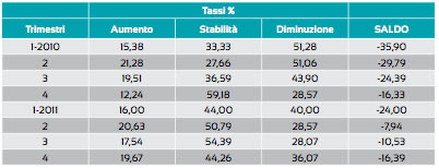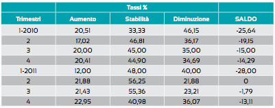 Dando uno sguardo alla situazione occupazionale, il settore dei servizi ha registrato saldo negativo nell'indagine campionaria, nel secondo trimestre 2011, mentre, successivamente, i saldi sono positivi.