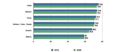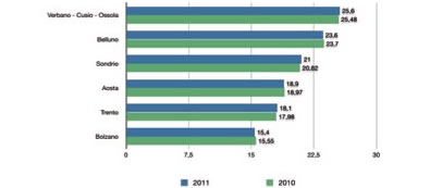 Figura 12.a - Le imprese del commercio nelle province alpine - 2010 - 2011 - Dati in % sul totale imprese attive. Fonte: elaborazione CCIAA Sondrio su dati Movimprese