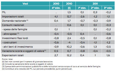 La figura 2.10 riporta il dettaglio delle principali componenti del PIL e le loro dinamiche nel corso del 2011. Osserviamo segno negativo per tutte le componenti nel terzo trimestre, tranne che per le esportazioni, ancora volano di crescita e motore di espansione del PIL, che però dal terzo trimestre 2011 segnano dato negativo (il primo da fine 2009), quindi indicando un inizio, tecnicamente, di recessione.