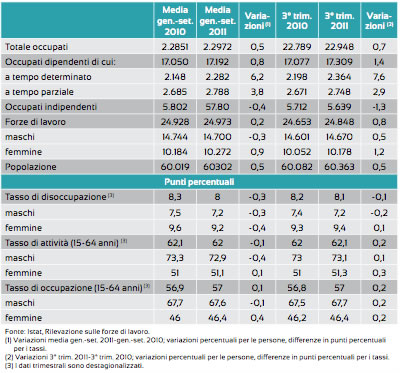 Dal punto di vista del mercato del lavoro, l'occupazione nella seconda parte dell'anno non è cresciuta mentre si è ridotto il ricorso alla Cassa Integrazione. In questo quadro hanno inciso fortemente le incertezze riguardo alla robustezza della ripresa. Con i dati di settembre invece si evidenzia la disoccupazione: i più penalizzati sono i giovani. La percentuale dei disoccupati, secondo l'Istat, per chi ha tra i 15 e i 24 anni, a settembre è salita al 29,3% e giunta al 30,1% in ottobre e novembre. Il tasso di disoccupazione è all'8,6%. Il quadro complessivo si prospetta più difficile per i giovani e i meno istruiti. Infatti, rispetto allo stesso periodo del 2010 la domanda per profili dedicati a mansioni manuali si è ridotta mentre è in crescita quello per profili professionali elevati. Il tasso di occupazione tra i possessori del solo diploma di scuola media inferiore è sceso dello 0,6% mentre quello dei giovani fra i 15 e i 34 anni si è ridotto dello 0,9%. L'ISTAT mette in luce come il tasso d'inflazione annuo, poi, a ottobre, sia salito al 3,4% dal 3,1% di settembre. Anche qui si tratta del dato più alto dall'ottobre 2008.