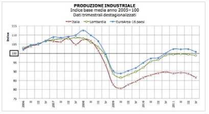 Il quarto trimestre 2011 nello specifico per la Lombardia ha rappresentato per la produzione industriale una variazione negativa sia del dato congiunturale (-0,5% il dato destagionalizzato) sia di quello tendenziale (-0,7%). Per le aziende artigiane manifatturiere i dati congiunturale (-1,1%) e tendenziale (-2,7%) registrano andamenti più negativi che per il manifatturiero; per l'artigianato la crescita media annua registrata è pari allo 0,3%.