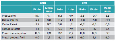 A livello tendenziale si evidenzia, tuttavia, la dinamica di rialzo dei prezzi delle materie prime che fanno segnare una crescita media annua del 15% (con una punta del 17% nel I trimestre 2011) a fronte di un rincaro medio dei prodotti finiti del 6%, con significativi assorbimenti di aumenti prezzi schiacciando in parte i margini di profitto. Una possibile via di uscita sarebbe rappresentata da investimenti in innovazione per recuperare in efficienza e produttività quanto perso negli aumenti di prezzo delle materie prime.