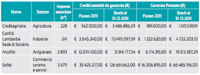 Per quanto riguarda il sistema dei confidi la tabella seguente riassume il quadro relativo a numero di imprese associate, crediti erogati e garanzie prestate, includendo dati di flusso e dati di stock fino al 31 dicembre 2011.