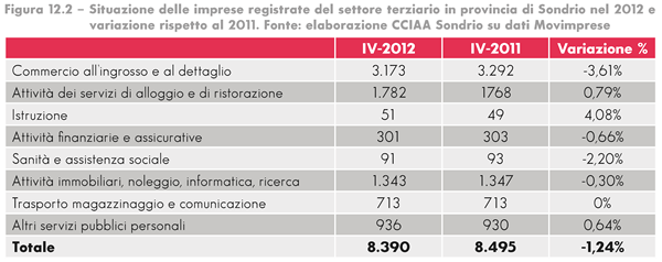 Figura 12.1 - Consistenza delle imprese registrate nel settore terziario per comparto di attività in provincia di Sondrio nel 2012. Fonte: elaborazione CCIAA Sondrio su dati Movimprese