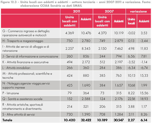 Abbiamo già evidenziato nel quadro relativo all’anagrafe delle imprese che il settore terziario è uno dei comparti principali del sistema economico valtellinese. Si assiste ad una progressiva terziarizzazione del sistema con una riduzione di imprese attive nel campo agricolo ed un aumento delle imprese del commercio, servizi e turismo.