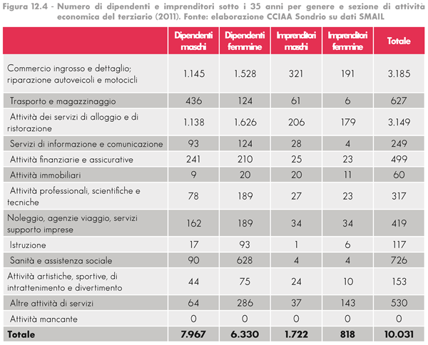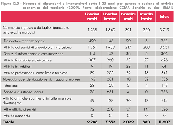 Nella considerazione del focus sulla componente giovanile e sul contributo fondamentale dei giovani al sistema economico, specie in tempo di crisi, considerando i giovani, dipendenti e imprenditori presenti nel settore terziario, le due figure 12.4 e 12.5 permettono di effettuare dei confronti sulle fotografie scattate a fine 2009 e 2011.
