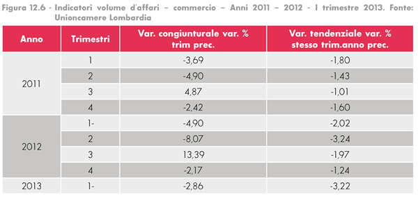 È stato introdotto anche un nuovo indicatore macroeconomico mensile di disagio sociale, chiamato Misery Index Confcommercio (MIC), dove vengono considerate le componenti relative al mercato del lavoro, la disoccupazione ufficiale, la cassa integrazione, gli scoraggiati e il tasso di variazione dei prezzi di beni e servizi acquistati in alta frequenza. Il MIC rappresenta una misura del disagio sociale: a fine 2012 ha raggiunto il massimo ed è raddoppiato in soli sei anni, dall’inizio del 2007 all’inizio del 2013. E’ naturalmente correlato con la povertà assoluta. Si prevedono oltre 4 milioni di persone assolutamente povere nella media del 2013, rispetto al dato certificato dall’Istat di 3,5 milioni circa per il 2011. Affermando che le persone assolutamente povere erano meno di 2,3 milioni nel 2006, in cinque anni ci sono stati circa 615 nuovi poveri al giorno, con previsioni ancora di notevole crescita1. Spostandosi alla dimensione regionale e locale, l’andamento del settore del terziario, commercio e servizi è monitorato attraverso la rilevazione congiunturale effettuata da Unioncamere Lombardia e un’indagine campionaria di imprese operanti nel comparto2. In Lombardia, a fine 2012 per l’andamento del commercio (volume d’affari) si registra una variazione congiunturale positiva del 4,8% rispetto al terzo trimestre 2012, mentre a livello tendenziale - rispetto cioè al trimestre finale del 2011 - si registra una riduzione del 5%. Come a fine 2011, anche a fine 2012 la variazione congiunturale è positiva, ma se ci si confronta con gli andamenti sull’anno, nel 2012 si registra un ulteriore peggioramento rispetto all’anno precedente.