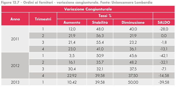 Osservando poi gli ordini ai fornitori, le due tabelle che seguono propongono sia le variazioni congiunturali sia quelle tendenziali.