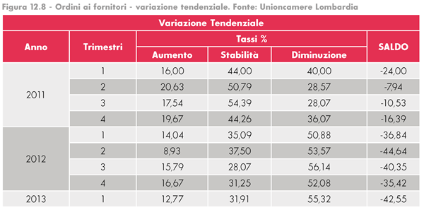 Considerando le variazioni tendenziali, si osserva che i dati sono sempre negativi, come nel 2011 e nel 2010: mentre nel 2011 i saldi erano stati generalmente meno negativi di quanto registrato nel 2010, nel 2012 i saldi tornano ad essere più negativi di quanto precedentemente registrato, anche se nell’ultimo periodo si registra un rallentamento nei saldi negativi, che passano da -44% del secondo trimestre a -40% del terzo e -35% del quarto (quest’ultimo dato molto simile a quanto registrato a fine 2011). E la situazione non sembra ancora migliorare nemmeno ad inizi 2013, quando il saldo registrato segna valori ancora in peggioramento.