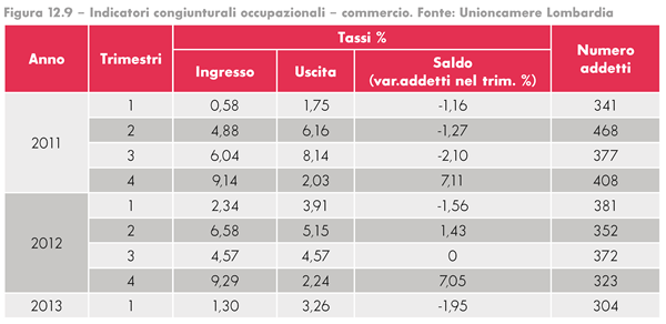 Non può mancare nell’indagine congiunturale anche uno sguardo alla dinamica dell’occupazione nel commercio, secondo le rilevazioni dell’indagine congiunturale effettuata; dai dati rilevati emerge che il saldo nel 2012 è positivo in tutti i trimestri, tranne che nel primo: il tasso d’ingresso è superiore a quello d’uscita, specie nel quarto trimestre. Mentre nel 2011 il saldo è stato positivo solo a fine anno, nel 2012 è negativo solo nel primo trimestre dell’anno. Saldo negativo nel primo trimestre dell’anno anche nel 2013, a giudicare dai primi dati disponibili dalle ultime rilevazioni congiunturali, con una certa contrazione quindi nel numero di addetti corrispondente.