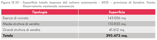 Dai dati dell’Osservatorio nazionale del commercio che sono presentati nella tabella 12.10, si conferma che il 48,4% del totale dei metri quadrati adibiti al commercio in sede fissa riguarda esercizi di vicinato (+0,2% rispetto al 2011), il 37,5% strutture di media grandezza (lo 0,3% in meno rispetto al 2011) mentre il restante 14% strutture grandi. Considerando la concentrazione degli esercizi sul territorio provinciale si evidenzia che il 92,3% degli esercizi commerciali è di vicinato (lo 0,2% in meno del 2011), il 7,36% è di media grandezza e lo 0,3% è di grandi dimensioni. In confronto con il 2011, si osserva una diminuzione dello 0,8% nella superficie totale del commercio in sede fissa. Questa riduzione è dovuta ad una contrazione dello 0,5% della superficie degli esercizi di vicinato e dell‘1,5% per le medie strutture di vendita. Non ci sono invece variazioni per le grandi strutture di vendita. Dal punto di vista del numero degli esercizi, si osserva che si riducono di 30 unità gli esercizi di vicinato e di 5 le medie strutture di vendita.
