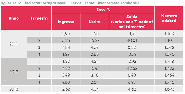 Osservando la situazione occupazionale, il settore dei servizi ha registrato saldi negativi, per le imprese oggetto dell’indagine campionaria, nel primo e secondo trimestre 2012, mentre, successivamente, i saldi sono stati positivi, anche se tornano nuovamente negativi ad inizi 2013.