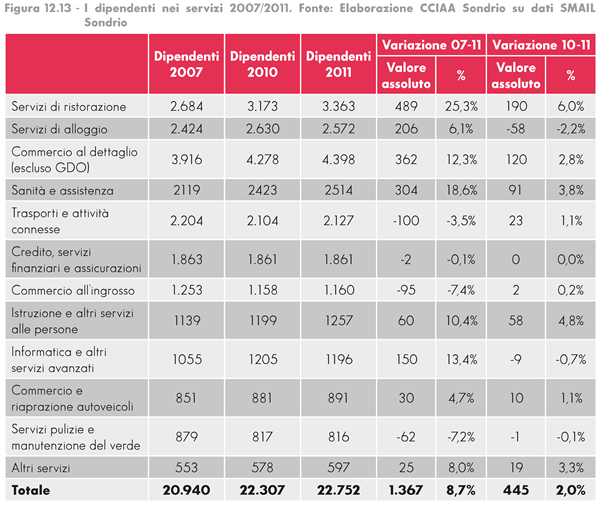 Gli investimenti nel settore dei servizi, sempre con riferimento al campione oggetto dell’indagine di Unioncamere, hanno registrato un aumento, del 3,5% rispetto a quanto dichiarato nella rilevazione precedente: per le imprese che hanno investito, per il 58% delle imprese gli investimenti correnti sono previsti in aumento, per il 33% delle imprese senza variazioni e solo per l‘8% delle imprese in diminuzione rispetto al 2011. Gli investimenti hanno riguardato per il 53% dei casi macchinari, per il 30% fabbricati e per il 38% investimenti in informatica. Gli investimenti realizzati sono stati circa il 4,3% del fatturato. Se consideriamo l’andamento occupazionale dei dipendenti nel comparto dei servizi, dalla banca dati SMAIL emerge che nel periodo 2007/2011 si registra un aumento dell’8,7% e del 2% nel periodo 2010/2011. Si registrano delle contrazioni, nell’ultimo anno disponibile, per i dipendenti nei comparti di servizi di alloggio (-2,2%), informatica (-0,7%) e servizi di manutenzione del verde (-0,1%).