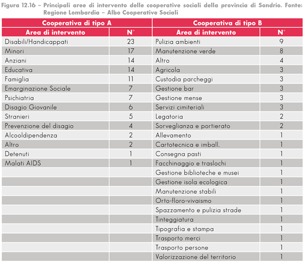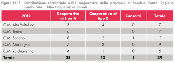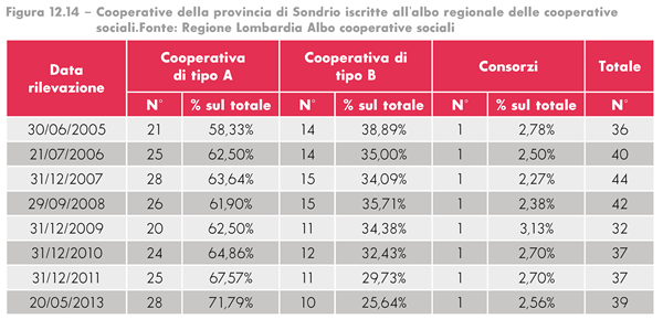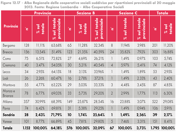 Complessivamente, il totale delle cooperative sociali in Lombardia al 20 maggio 2013 è di 1.795 (erano 1.669 nel 2011), per un aumento del 7,5%. Le cooperative sociali della provincia di Sondrio rappresentano il 2,17% del totale regionale, valore stabile rispetto al 2011. A livello regionale le cooperative di tipo A rappresentano il 64,18% del totale, quelle di tipo B 32,09% del totale; rispetto al 2011 si registra un leggero incremento del peso delle cooperative di tipo B pari a 0,5% circa. In provincia di Sondrio le cooperative di tipo A sono il 71,79% del totale, quelle di tipo B il 25,64 % del totale, con un aumento del peso delle cooperative di tipo A rispetto al 2011 pari al 4% circa.