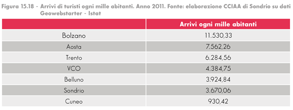 La tabella in figura 15.18 evidenzia il numero di arrivi ogni mille abitanti per i vari territori alpini, confermando il primato di Bolzano, dove gli arrivi ogni mille abitanti erano 11.223 nel 2010 e sono 11.530 nel 2011. Non vi sono variazioni di posizione rispetto al risultato relativo al 2010 e tutti i territori migliorano la posizione. Sondrio è in penultima posizione, molto al di sopra del valore registrato da Cuneo e con un dato che aumenta significativamente rispetto al 2011: mentre nel 2010 gli arrivi in Valtellina e Valchiavenna per mille abitanti erano 3.469 e salgono a 3.670 nel 2011.