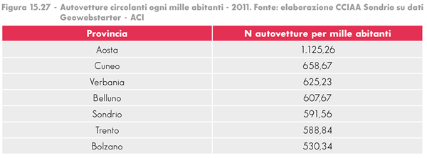 La tabella in figura 15.27 evidenzia che il maggior numero di veicoli si ha ad Aosta, per un valore che è quasi doppio di quello della provincia che si trova in seconda posizione, Cuneo.Sondrio si colloca ancora nella parte bassa della graduatoria con 591 autovetture per 1.000 abitanti, (erano 583 l’anno precedente) appena prima di Trento (con 588) e di Bolzano (con 530 autovetture per 1.000 abitanti, anch’essa in aumento di 8 unità).