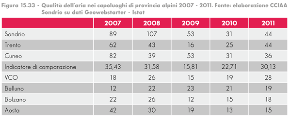 Se ci spostiamo ad osservare l’indicatore relativo alla qualità dell’aria, possiamo rilevare che anche nel 2011 il capoluogo Sondrio, fra i vari capoluoghi alpini, ha registrato il maggior numero di superamenti di livello di PM 10, 44, come Trento, con dati che nel 2011 sono aumentati rispetto a quanto registrato nel 2010. Il dato migliore è quello di Aosta con 15 giorni di superamento del livello di PM 10 nel 2011. Sondrio quindi si colloca ben al di sotto dell’indicatore di comparazione, pari a 30 giorni; anche l’indicatore peggiora nel passaggio 2010, 2011, ma come numero di giornate peggiora meno di quanto sia avvenuto al dato di Sondrio. Il dato registrato per la qualità dell’aria nel 2011 quindi è di rallentamento.