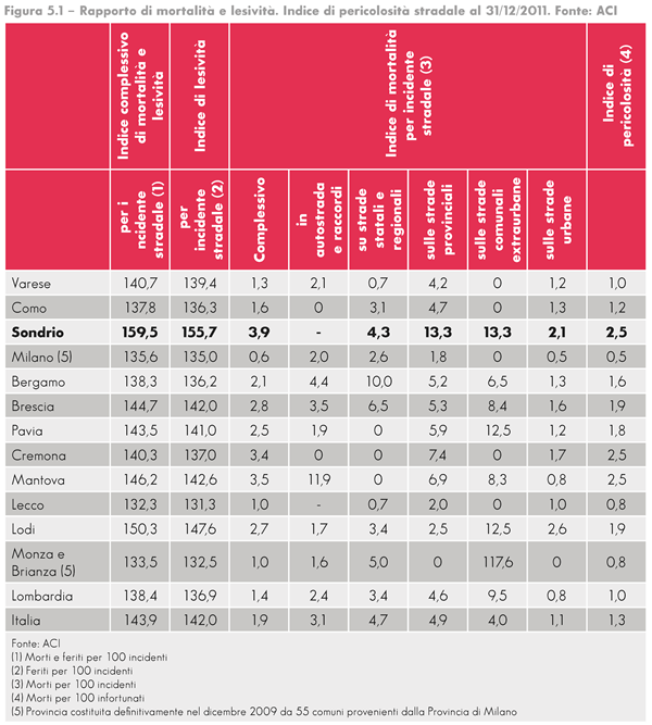 Dai dati resi disponibili da ACI possiamo notare poi che a livello nazionale l’indice complessivo di mortalità e lesività, che era 145,1 nel 2010, è sceso a 143,9 nel 2011. Nel 2008 Sondrio si collocava ad un livello ben più alto della media nazionale (151,7), mentre nel 2010 il valore indice è sceso ben sotto quello medio, con 136,6, più basso anche del valore medio regionale. La situazione invece è andata nell’ultimo anno di osservazione peggiorando: a fronte di un dato del 2010 di 136,6, c’è stato un peggioramento dell’indice complessivo, che ha raggiunto 159,5 a fronte di un dato medio lombardo di 138,4 e nazionale di 143,9. Il dato di Sondrio risulta essere il peggiore di tutte le province lombarde. In provincia di Sondrio nel 2011 si sono registrati 467 incidenti, circa 35 in più del 2010. Gli incidenti mortali sono stati 17 nel 2011, così come erano stati 17 anche nel 2010.
