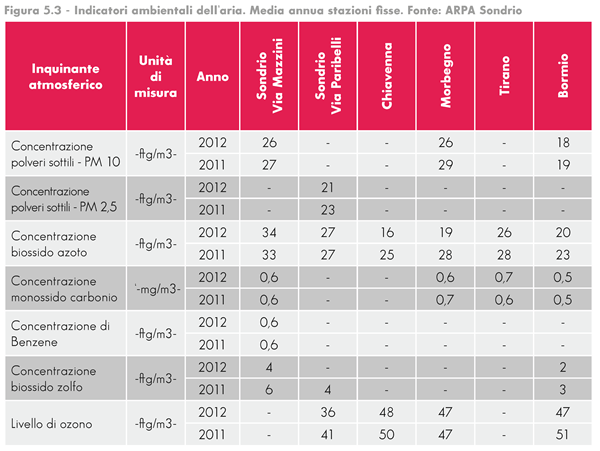 Come di consueto, con riferimento all’ambiente consideriamo i dati registrati da ARPA relativi alla concentrazione di inquinanti atmosferici e alla qualità dell’aria. Per quanto riguarda la concentrazione di PM 10 e di polveri sottili, si sono registrati in tutti i casi dei miglioramenti rispetto alle rilevazioni precedenti, mentre per il biossido d’azoto c’è stato un leggero aumento a Sondrio e diminuzioni in tutti gli altri contesti, come evidenziato nella tabella in figura 5.3. La concentrazione di monossido di carbonio segna invece delle riduzioni in tutti i mandamenti, con un leggero aumento solo in quello di Tirano.