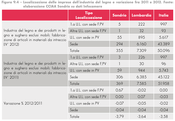 Se si considerano le unità locali nel settore emerge la seguente situazione: secondo i dati SMAIL al 2011 vi sono 331 unità locali per quasi 951 addetti che operano nella fabbricazione di prodotti in legno e sughero, su un totale di 372 unità locali per circa 1.200 addetti nel settore industria del legno. In provincia di Sondrio fra 2011 e 2012, utilizzando i dati Movimprese, la variazione complessiva delle unità locali per il settore dell’industria del legno è di -3,7%, in linea con quanto registrato a livello lombardo e nazionale. La variazione percentualmente maggiore che si registra confrontando i due anni è quella per le aziende che hanno la prima unità locale in provincia e sede fuori provincia: aumentano da 3 a 5. Si riducono di 4 invece (-6,7%) le unità locali con sede in provincia e le sedi d’impresa (-3,9%) che passano da 306 a 294.