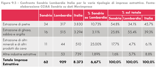 Se ci si confronta con il 2011, come emerge dalla tabella, le situazioni locale, regionale e nazionale sono sostanzialmente in linea. Le quote percentuali sul totale non registrano significative variazioni rispetto al 2011. Si osservano riduzioni nel numero di imprese estrattive in tutti gli ambiti territoriali: 3 a Sondrio, 31 in Lombardia, 174 in Italia, corrispondenti ad una riduzione del 4,6% in provincia di Sondrio, del 3,2% a livello lombardo e del 2% a livello nazionale.