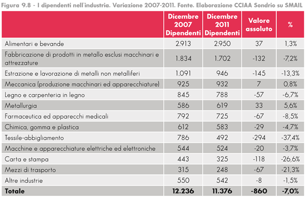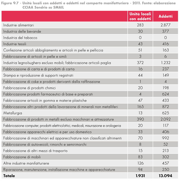 Secondo la banca dati SMAIL, alla fine del 2011, in provincia di Sondrio ci sono, per le attività manifatturiere, 1.931 unità locali con addetti, per un totale di 13.094 addetti, di cui 1.928 imprenditori e 11.166 dipendenti. Dalla stessa banca dati si rileva che nel 2007 le unità locali con addetti erano esattamente 50 in più e gli addetti 14.009, quindi circa 1.000 in più. La riduzione è stata nettamente più consistente per i dipendenti passati da 11.991 a 11.166 e meno per gli imprenditori, anch’essi diminuiti, ma solo di 90 unità.