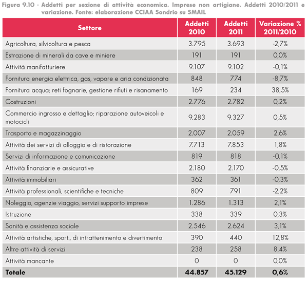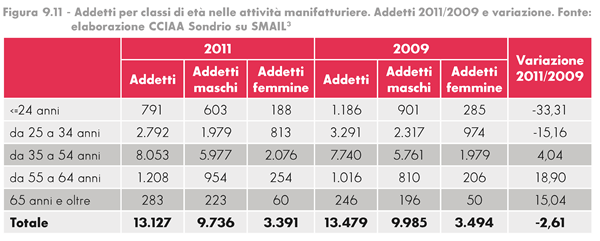 Complessivamente, per il totale del settore manifatturiero, quindi, le unità locali con addetti a dicembre 2011 sono 1.931 (erano 1.966 nel 2010), per un totale di addetti pari a 13.094 (con una contrazione dello 0,8% rispetto al 20102. Il settore manifatturiero occupa complessivamente il 22,58% degli addetti che lavorano in provincia di Sondrio (erano il 22,7% a fine 2010, quindi con piena stabilità rispetto al 2010).