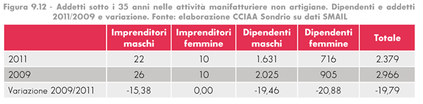 Per offrire qualche riflessione in più è possibile considerare anche la situazione degli addetti e imprenditori sotto i 35 anni nel settore manifatturiero (aziende non artigiane) valtellinese, nel 2009 e nel 2011 (figura 9.12). Se si confronta la situazione del 2011 rispetto al 2009 si osserva una riduzione degli addetti pari a circa il 20%, con una contrazione meno evidente per gli imprenditori maschi (-15%), nessuna variazione per le donne imprenditrici. Sul totale addetti nel settore manifatturiero in queste classi di età si rileva che il 70% circa è composto da uomini. Anche se si considerano solo i dipendenti, la quota di uomini è esattamente la stessa, il 70% del totale.