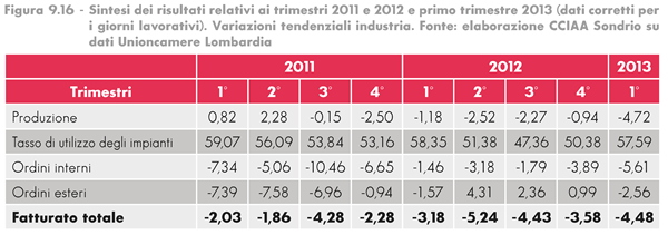 La figura 9.16 offre un quadro riassuntivo dei dati relativi ai trimestri 2011, 2012 e I trimestre 2013 per l’industria nelle variazioni tendenziali. Se si osservano tali dati di sintesi si nota che la produzione ha segno negativo in ogni trimestre 2012; per gli ordinativi si ha segno positivo solo per l’estero nei due trimestri centrali. Il fatturato totale segna riduzione a livello tendenziale in tutti i trimestri, ma negli ultimi due trimestri più contenute rispetto al valore di rallentamento peggiore, quello registrato nella primavera 2012 (II-2012).