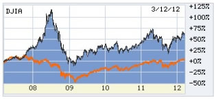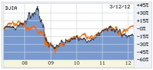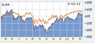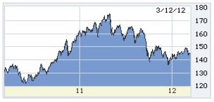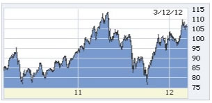 Figura 4.1a – Confronto andamento produzione industriale e prezzo del petrolio da aprile 2011 a marzo 2012. Fonte: Wall Street Journal