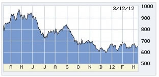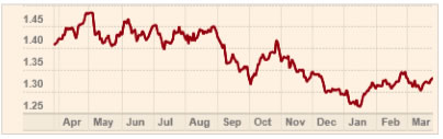 Se osserviamo il mercato dei cambi, da una situazione di incertezza ed instabilità si è passati nel secondo trimestre 2011 ad un cambio stabile. La figura 4.6 mostra il tasso di cambio Euro-Dollaro ed evidenzia un apprezzamento costante da gennaio con leggero deprezzamento nell'ultimo trimestre dell'anno, ma con trend comunque in crescita. Il cambio Euro-Dollaro nel 2011 è stato molto influenzato dalle tensioni sul debito sovrano prima del varo di misure comunitarie per fronteggiare la crisi. Dal punto di vista valutario, l'Euro non è stato mai messo in discussione anche se confrontato a marzo 2012 e marzo 2011 ha complessivamente perso il 5,40%. Diversi osservatori hanno evidenziato che anche durante i periodi più bui della crisi del debito che ha colpito Grecia, Irlanda, Portogallo e poi ha portato vicino al baratro anche l'Italia, l'Euro ha sempre mantenuto un cambio equivalente o anche più alto rispetto al Dollaro. Fra i motivi che hanno contribuito a tenere il valore dell'Euro alto sono stati identificati: 1) il fatto che la Cina ha acquistato debito sovrano dai Paesi Eurozona per una quantità significativa e comparabile a quanto ha fatto la BCE; 2) una veloce ripresa in estate nel cuore dell'Eurozona in Germania con un aumento nell'export e nella produzione manifatturiera (+9% export e +5% aumento nel manifatturiero); 3) l'alto tasso di interesse della BCE rispetto a quello della FED[2].