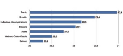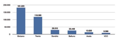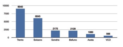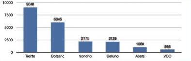 A Trento il numero di impianti era 5.452 ed è ora 9.040, con un aumento del 65%; a Bolzano gli impianti erano 3.862 ed oggi sono 6.045, con un aumento del 56,5%. Sia pur fanalino di coda, anche Verbania ha raddoppiato il numero di impianti rispetto al 2011, da 278 a 566, quasi quadruplicando invece la potenza installata.