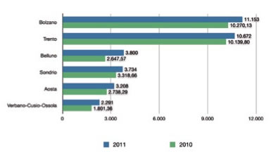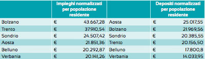 Se ci spostiamo a considerare anche gli impieghi complessivi possiamo osservare la situazione registrata nella figura 7.b che presenta la situazione nei diversi territori alpini. Bolzano e Trento si collocano ai primi posti. In posizione intermedia si colloca poi Sondrio che precede Belluno e Verbania; infine Aosta. Considerando gli impieghi normalizzati per popolazione residente possiamo osservare che ai primi posti ci sono Bolzano e Trento, con un valore superiore ai 43.000 Euro per Bolzano e ai 37.000 Euro per Trento. In posizione intermedia si trova Sondrio con un valore di impieghi pro-capite pari a circa 24.500 Euro. Se consideriamo i depositi normalizzati per popolazione residente troviamo conferma che anche per il 2011 Aosta registra livelli di depositi bancari procapite più elevati (sui 25.000 Euro); segue Bolzano e subito dopo Sondrio (con un valore di depositi procapite che aumenta rispetto al 2010 e arriva a circa 20.000 Euro). Nelle ultime posizioni troviamo, come nel 2010, Belluno e Verbania (figura 7.c).